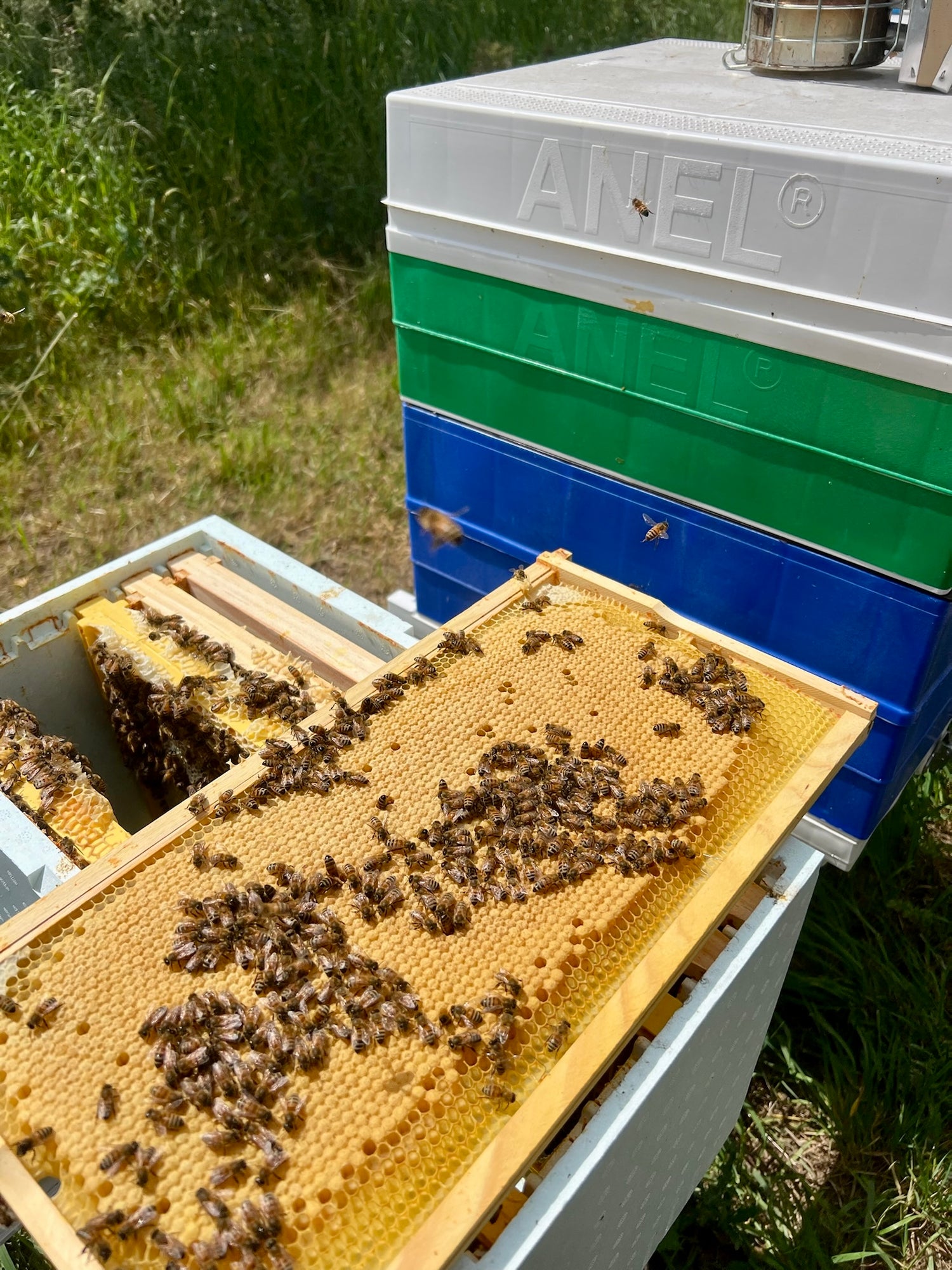 All of our honey-producing and breeder colonies live in ANEL Langstroth hives, chosen for their durability, insulation, and bee-friendly design.